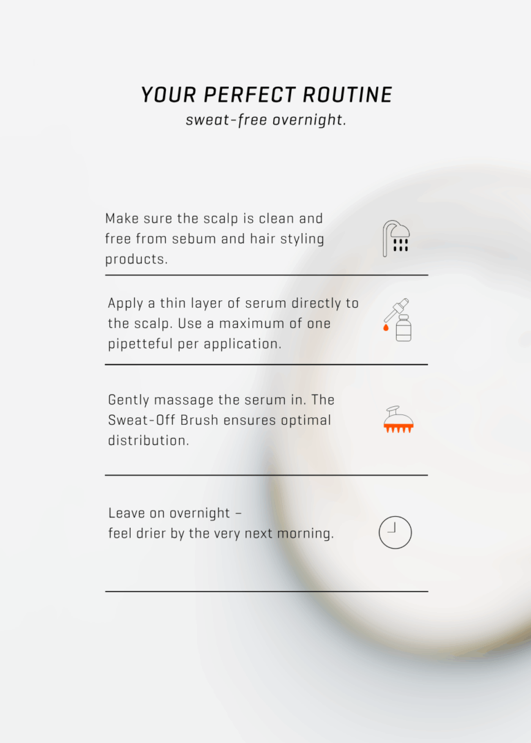 The Sweat-Off Serum targets and prevents sweating on the scalp both effectively and long-term. The unique formula is based on aluminium chloride – the most effective non-invasive active ingredient in dermatology for treating sweating. This high level of efficacy is complemented by two proven ingredients in scalp care: Provitamin B5 (Panthenol) provides extra care and long-term moisture for the skin, while Biotin helps preserve the natural beauty of the hair.