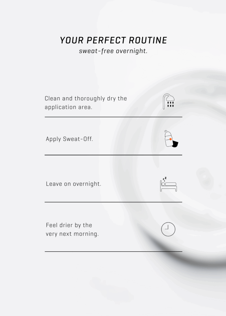- The conventional deodorant is no longer required, but can still be used if desired – please wait six to eight hours after applying Sweat-Off.