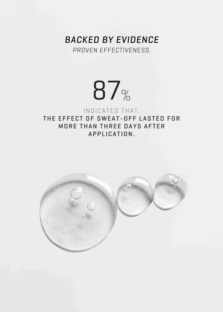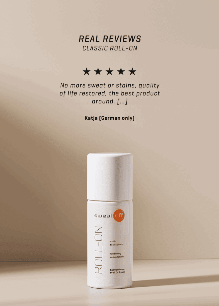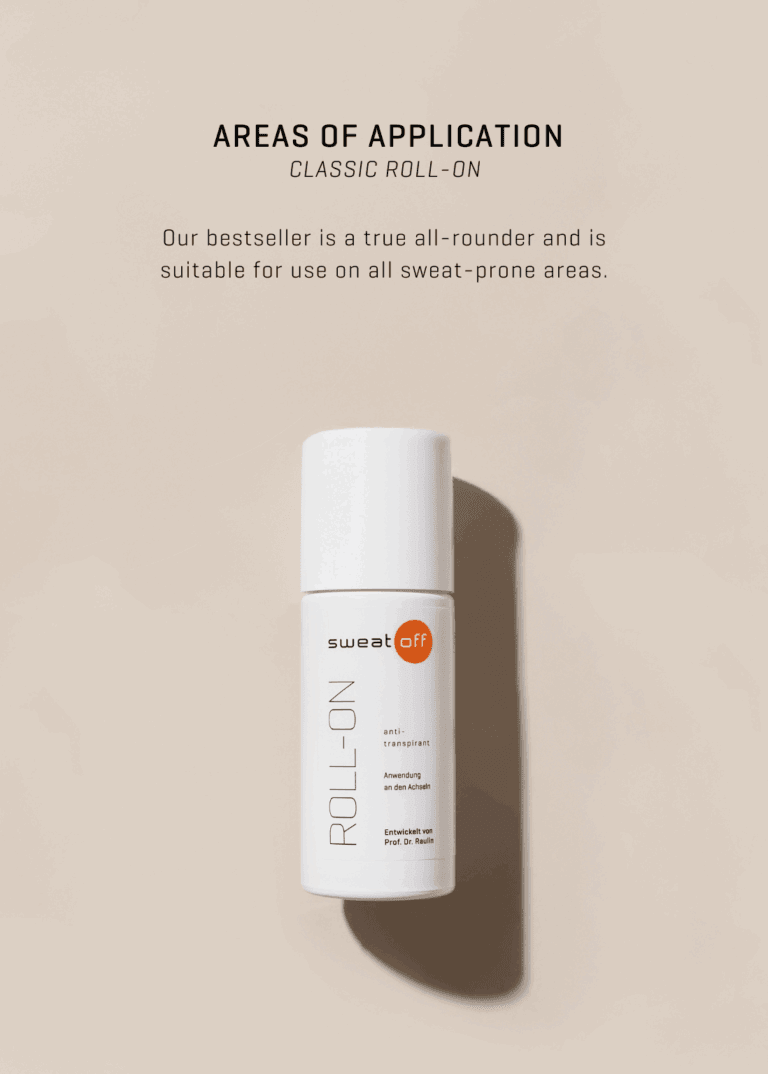 The Sweat-Off Roll-On is based on aluminium chloride, the most effective non-invasive active ingredient in dermatology for combating sweat. It works by temporarily and locally reducing the activity of the sweat glands, preventing sweat from being released. This also stops odour, which only develops when bacteria on the skin break down sweat. Its balanced formulation supports the skin’s natural barrier and is clinically proven to be very skin-friendly.