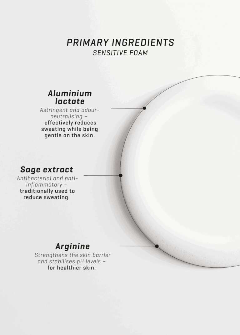 Independent studies have shown that the Sweat-Off foam effectively reduces perspiration. The high level of effectiveness is based on aluminium lactate, an innovative active ingredient in sweat treatment. At the same time, the foam has been proven to be very well tolerated. The combination with skin-protecting sage extract and skin-barrier-strengthening arginine makes it ideal for long-term use in sensitive skin areas.