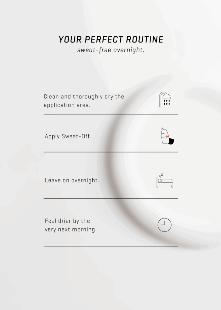 - The conventional deodorant is no longer required, but can still be used if desired – please wait six to eight hours after applying Sweat-Off.