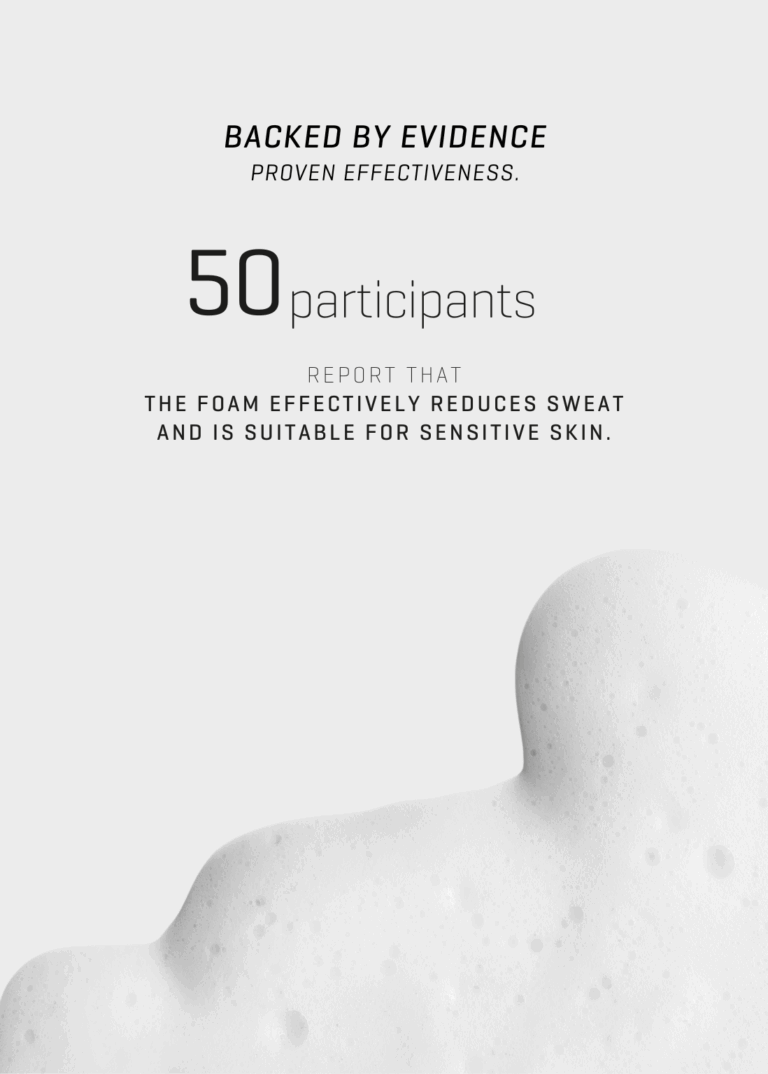 Our antiperspirant foam is the best solution against back sweat, chest, stomach and buttocks. Its unique consistency allows the foam to be applied easily to larger areas of the body. It absorbs quickly, leaving no build-up.
